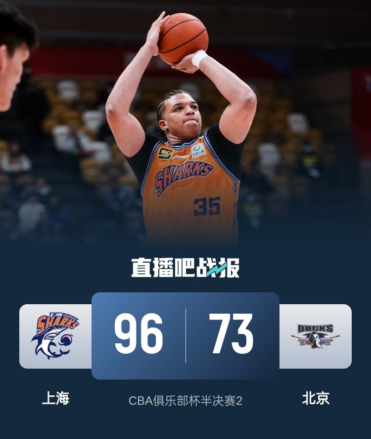 比赛开始,北京多点开花率先发力打出11-1不错开局,刘礼嘉和布莱德索接连三分止血,北京进攻受阻,李添荣接连三分反超比分,首节上海领先8分,次节洛夫顿带领上海上来又是13-2直接拉开近20分领先,杰曼接连突破止血,但洛夫顿挡不住帮助上海半场还领先18分。下半场,上海继续发力,再打出15-4攻击波直接拉开近30分领先,北京接连三分止血,但李添荣三分还能回应,三节上海领先到27分,末节双方展开拉锯战,李添荣命中个人第6记三分,上海顺势拉开30分以上领先,最终上海96-73大胜北京晋级决赛,决赛对手为新疆(比赛将于2月15日19:30开打)。