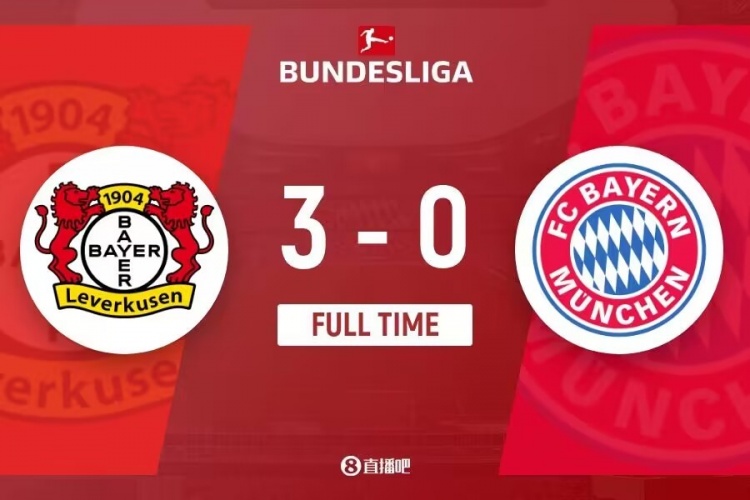 全场比赛结束,勒沃库森3-0拜仁慕尼黑。