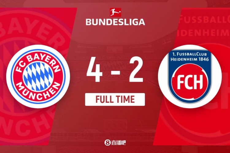 伤停补时2分钟,全场比赛结束,拜仁4-2海登海姆。