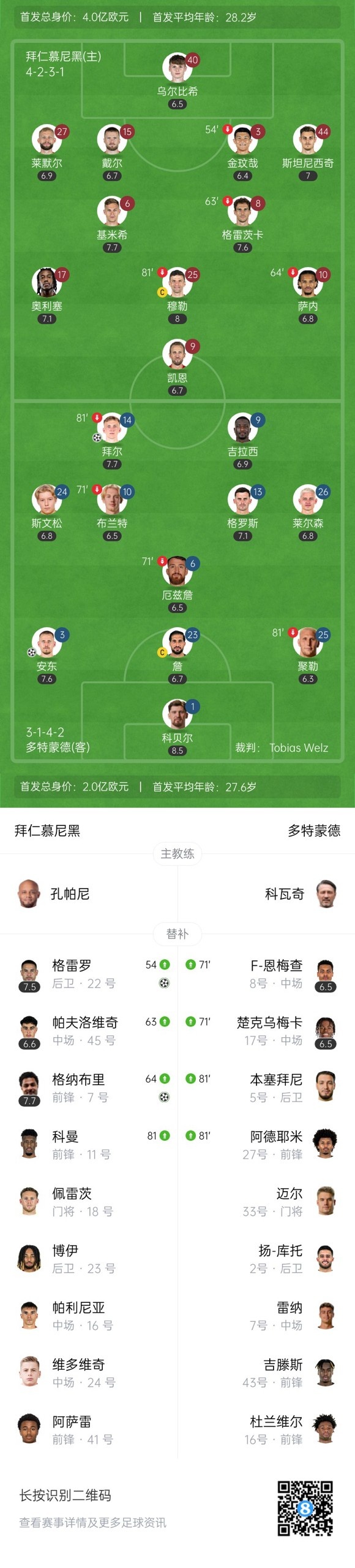 第47分钟,多特打破僵局!反击机会莱尔森右路传到禁区后点拜尔高高跃起头球破门,拜仁0-1多特。↓
