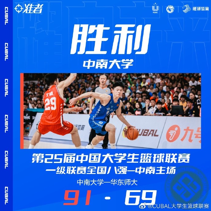 第四节,龚思成先中三分,中南大学一波7-0一度将优势扩大到30分,李政崇打成2+1止血,华东师大多点开花稍稍迫近比分,20分以上的分差让比赛失去悬念,但中南大学依然保持攻防两端的强度,比赛末段双方各自喊出暂停调整,林天驹抢投三分命中。最终,中南大学91-69击败华东师大,获得胜利。