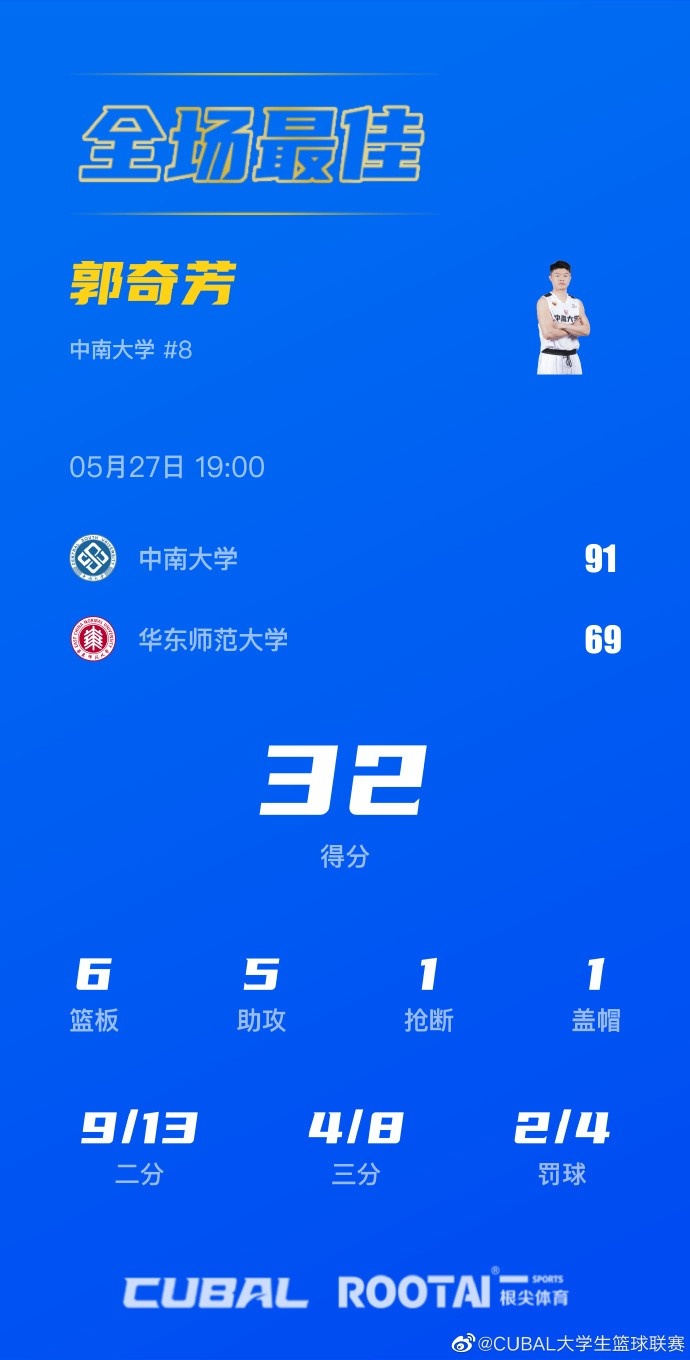 中南大学:郭奇芳32分6板5助,付永康17分6板,张东旭13分,赵中兴10分13板,龚思成17分6板7助4断