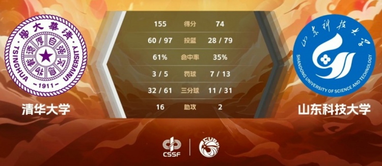 巨大分差让末节早早失去悬念,而清华大学也进行轮换鸣金收兵,山东科大面对的强度下来后压力骤降,刘闯和侯天杰相继命中三分也帮助他们在这一节的进攻对决上稍稍占据上风。不过后半段清华仍然延续高效攻势很快继续扩大领先。最终,清华大学155-74狂胜山东科技大学迎来完美三连胜。