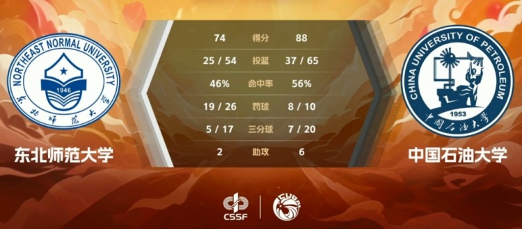 末节开局郜周旭手热接连命中三分并为球队拿到20分以上的领先;东北师大则大比分落后只能靠着不断冲击篮下造杀伤拿分,节中一度追至14分的情况下又被武涛投进底角三分;中国石大一直保持着两位数的领先直到结束。最终,中国石油大学88-74轻取东北师范大学拿下排位赛胜利。