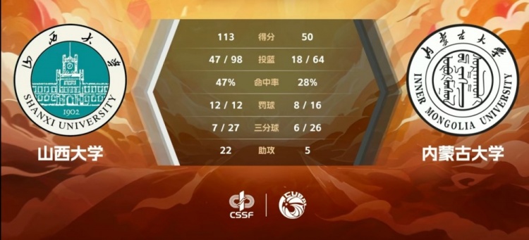 第四节,内蒙古大学进攻端毫无起色,半节的时间仅拿到2分,山西大学持续发力打出12-2的攻击波将分差拉开到50分以上,又是刘孟川破荒,但山西大学越战越勇将优势扩大到60分以上。最终,山西大学113-50狂胜内蒙古大学。