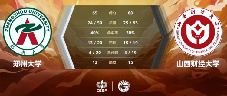 末节决胜山西财大稳定拿分一直确保领先,郑州大学则一直被动追分,刘炳志的三分和高乾的高位跳投得分虽然为他们咬住比分但却始终无法更进一步。最后决胜时刻手握8分的山西财大突然哑火且连续出现失误,季楷皓和高乾的连续拿分将劣势缩小至1分突然看到希望。读秒阶段郑州大学错失致命防守篮板,郭星海顶住压力两罚全中确保山西财大三分领先并奠定胜局。最终,山西财经大学力克郑州大学顺利晋级。