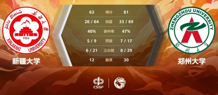末节双方延续拉锯交替拿分,但手握大比分领先的郑州大学完全感受不到威胁,高乾和季楷皓相继拿分确保大比分优势。这之后郑州大学完全掌控局面并早早撤下主力。最终,郑州大学轻取新疆大学拿下比赛。