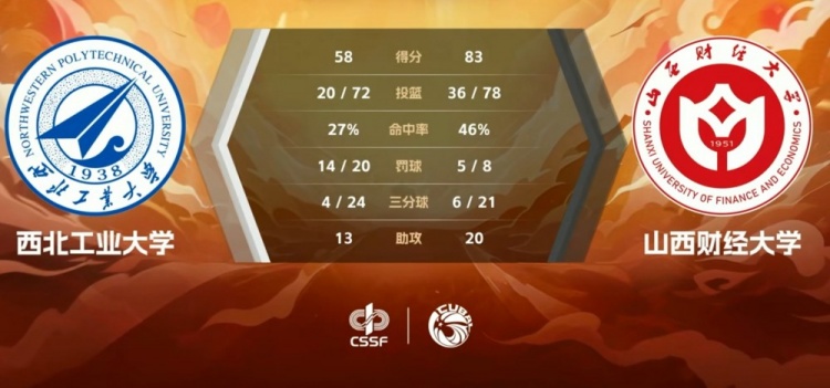 末节争夺,两队展开对攻,西北工大冲击篮筐频频得手,山西财大多点开花还以颜色,双方陷入3分钟的得分荒,郭星海强攻得手打破僵局,山西财大延续火力,赵悦寒三分将分差拉开到20分以上,最终,山西财大83-58轻取西北工大。