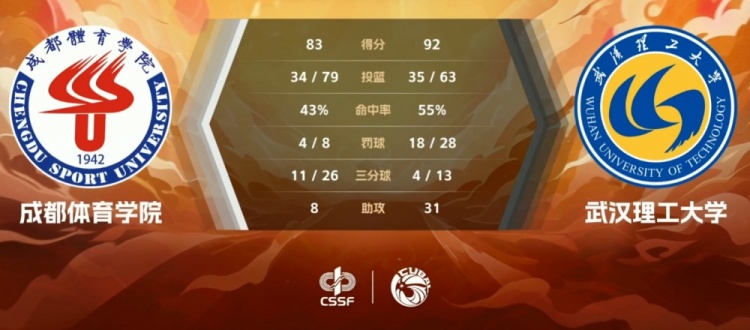 末节双方继续拉锯,王舒畅稳定输出为武汉理工保持两位数优势,成都体院的攻势更加靠外,谢钰栋的三分和贾正浩反击得分紧追比分。拉锯战阿木以合和拜全相继命中三分将劣势缩小至个位数看到希望,不过黄智两个回合都回以进球守住优势,时间也所剩无几。最终,武汉理工大学92-83击败成都体育学院夺得赛区第七名。