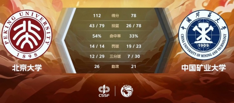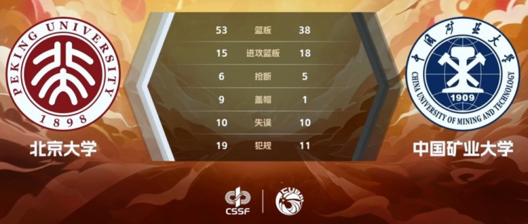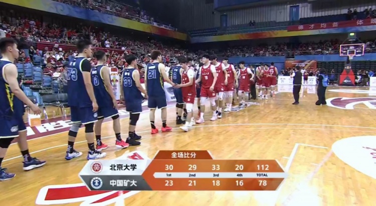 末节矿大尝试抢攻但手感不佳,吕克古一个回合两次三分出手都没能命中,随后疯狂进攻篮板但一个回合三次三分都没能命中;反倒是北大虽然大部分替补阵容但打得游刃有余一直稳定大比分优势,比赛也早已失去悬念。最终,北京大学主场112-78大胜中国矿业大学,以两回合全胜顺利晋级半决赛。