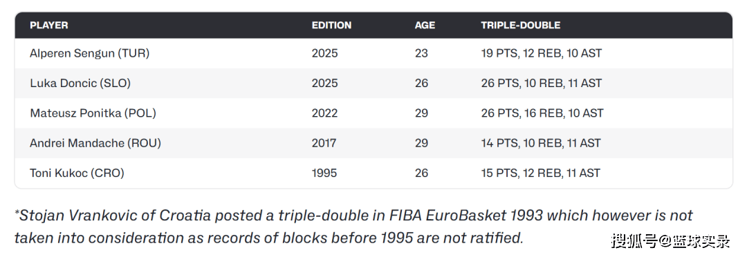 在如今的NBA,三双并不少见,有很多角色球员都能拿到三双,但在欧锦赛,三双可就不简单了,算上申京这一场,欧锦赛历史才出现过6次三双,此前的5次分别是: