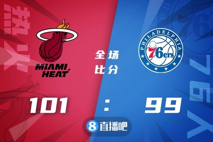 双方当家球星巴特勒和哈登打得都很主动,但热火的篮板球占尽优势,连续的前场篮板拼抢逐渐建立起主动权,随后恩比德连续造杀伤帮助76人追分,但无奈失误过多,加上巴特勒控场全面发挥,热火还是保持8分领先。下半场,马克西手感不错单节砍下14分帮助76人持续追分,但热火总能给出回应并保持微弱领先,末节热火依靠三分打出一波10-2直接领先到双位数,但76人马上回应一波10-1再次咬住比分,比赛胶着到最后时刻,阿德巴约贡献关键大帽,巴特勒关键罚球2中1,但哈登绝杀三分不中,最终热火101-99险胜76人,终止4连败。