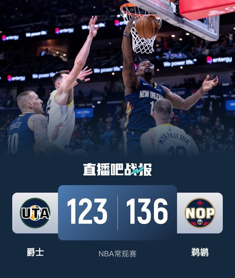 🏀锡安23分钟砍24+14+6 麦科勒姆26+5 鹈鹕主场轻取爵士