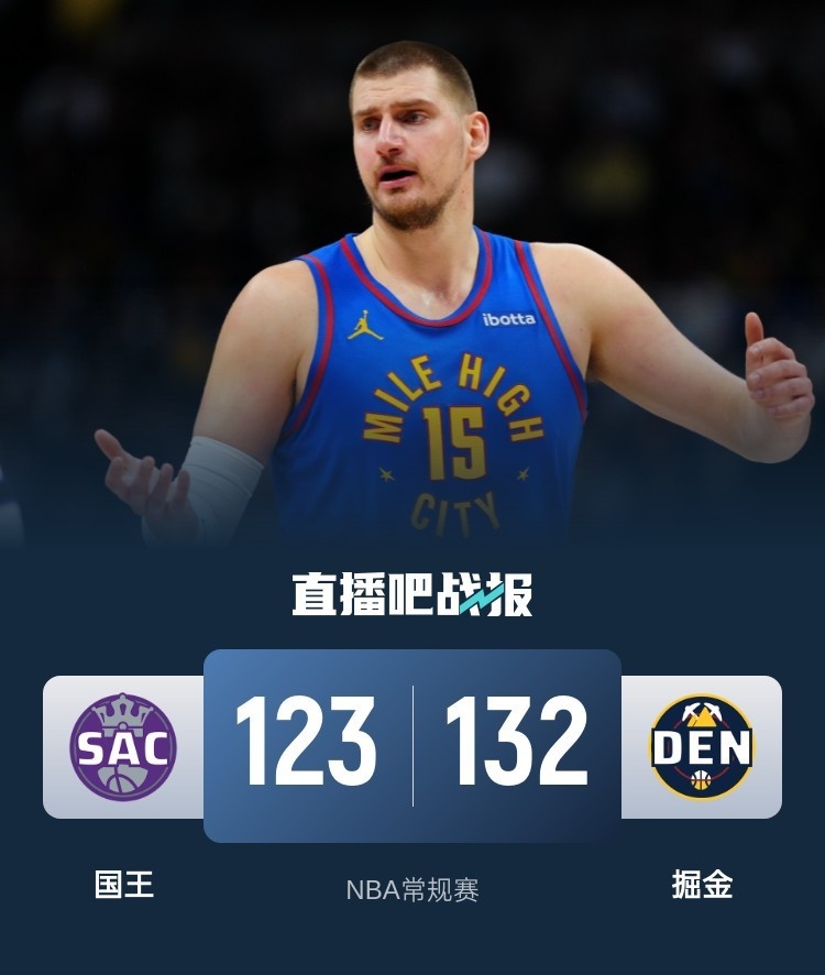 开场后掘金在约基奇的带领下就展现出不俗状态,国王前半节进攻顺畅还能咬住比分,但第一节后半段他们进攻效率下降,掘金逐渐将比分拉开。第二节上来穆雷展现火热手感频频拿分继续扩大优势,国王进攻端手感一把,萨博尼斯命中率也不高,掘金全面开花在半场结束时取得22分优势。易边再战,虽然国王一度掀起反扑缩小分差,但在约基奇的带领下掘金进攻依旧打得非常流畅,他们再次将分差拉大到20分以上,三节结束时约基奇扔进一记后场压哨三分。末节国王轮换阵容轰出一波14-0的攻势重新打回悬念,掘金主力回来后一度稳住局面,但麦克德莫特连续三分追到只差5分,约基奇两罚稳健,布劳恩抢断反击锁定胜局。最终掘金132-123击败国王取得4连胜。