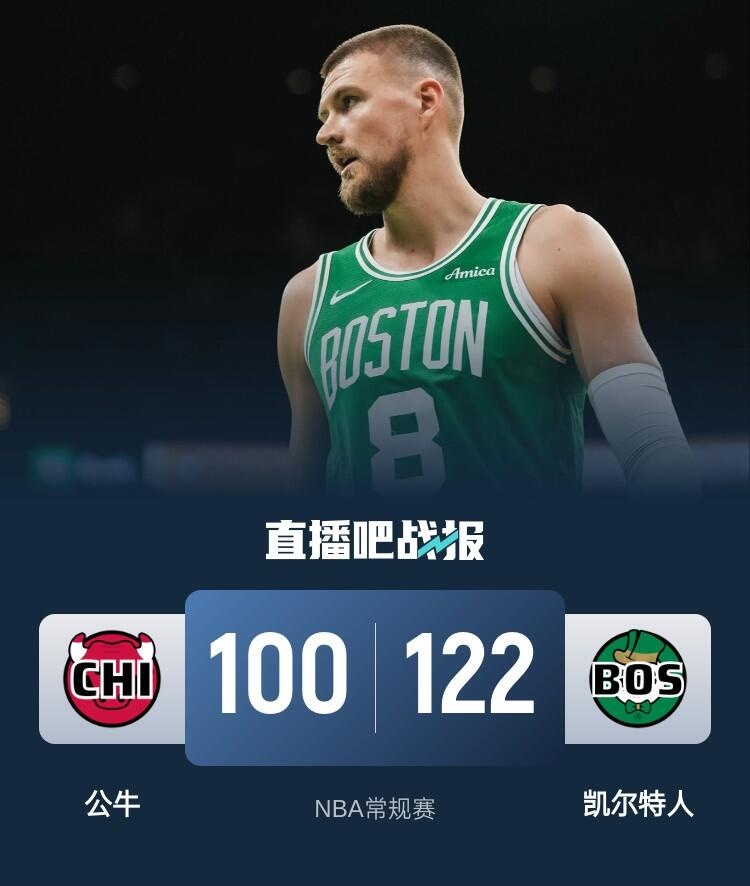 比赛开始,波津接连三分连砍13分,凯尔特人轰出10-0开局建立主动权,球哥接连三分助公牛12-2一度反超比分,首节绿军领先3分,次节凯尔特人外线接连发炮重新建立双位数领先,公牛接连追分,但波津连续三分回应半场轰下26分,凯尔特人半场领先16分。下半场,双方展开拉锯战,波津、布朗和德里克-怀特连续3记三分再中,绿军拉开20分以上领先,末节双方命中率都有下降,公牛全面皆兵追分,但绿军总能回应保持住十几分领先,最终凯尔特人122-100轻取公牛。