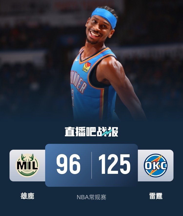 开场后没多久亚历山大就带队建立起领先,雄鹿失误连连,防守端也是完全限制不住亚历山大,亚历山大单节轰下21分。第二节上来雷霆进攻依旧打得十分犀利,他们多点开花继续将分差拉大,半场过后雷霆领先34分。下半场回来,雄鹿虽然在进攻上有所起色,但是防守上依旧无法限制雷霆,分差来到40分以上,第四节彻底沦为练兵时间,最终雷霆125-96送给雄鹿4连败。