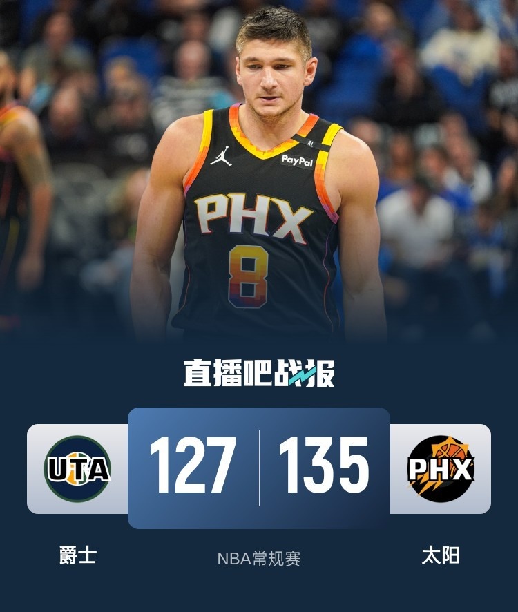 比赛开始,布克高效输出,但爵士多点开花将分差拉开到两位数,次节太阳火力全开,布克里突外投连续得分,爵士命中率下降,太阳单节净胜10分,半场双方战成55平。易边再战,双方大打对攻,太阳火力更猛,布克手感滚烫第三节再拿10分,末节太阳占得先机将分差拉开到两位数,爵士奋力反击轰出13-0的攻击波扳平比分,双方争夺陷入白热化,关键时刻凯斯勒连续补篮拿分,科利尔压哨也有,阿伦三分绝平,将比赛拖入加时。加时赛,太阳连中三分轰出11-3的攻击波锁定胜局。最终,太阳135-127加时击败爵士,主场过关。