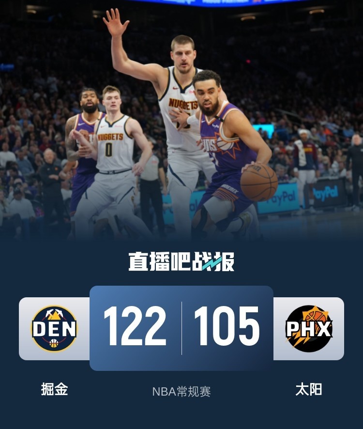 比赛开始,双方大打对攻,约基奇表现全面,穆雷高效输出,太阳多点开花给出回应,次节两队继续缠斗,掘金稳扎稳打保持场上主动,半场战罢掘金63-55领先太阳。易边再战,掘金持续发力将分差拉开到两位数,太阳不断冲击篮筐努力追赶,末节掘金一举将优势扩大到20分以上,太阳大势已去无力回天。最终,掘金122-105击败太阳,客场过关。
