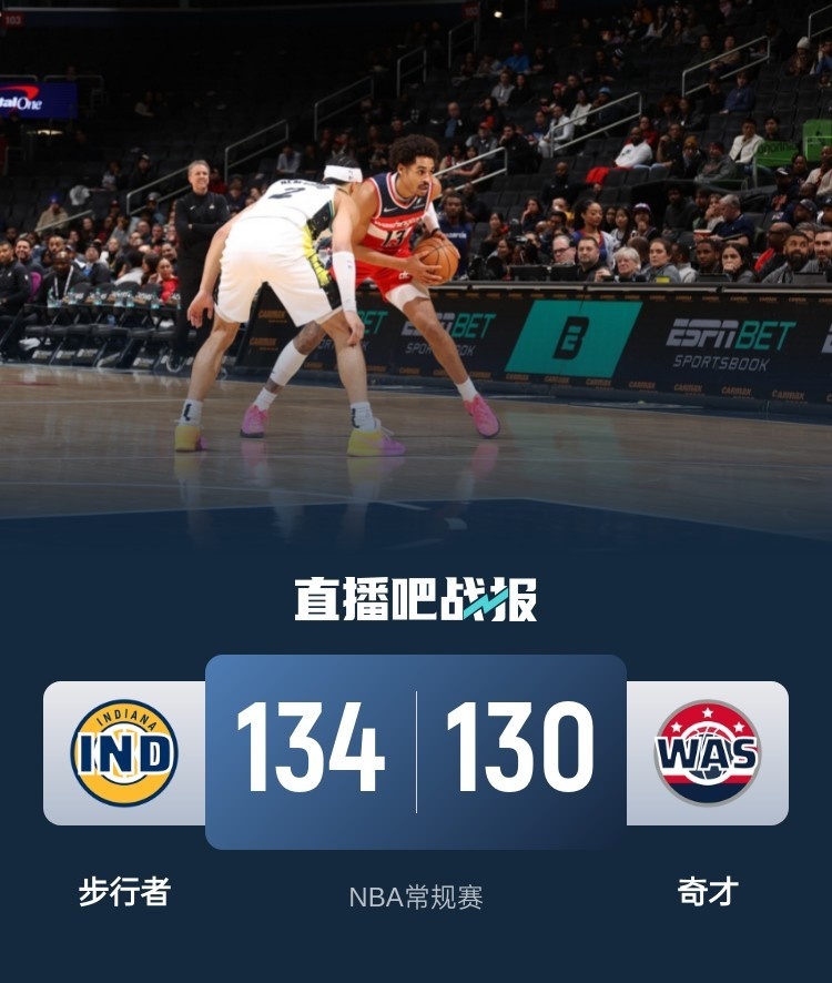 比赛上来,两队就打得很胶着,场上比分交替领先,奇才连进三记三分后开始占据场上主动,不过分差也没能拉开,次节步行者的表现更差,不但进攻没打开还让奇才单节命中七记三分球,普尔在节末更是连中三记,分差也是达到两位数,半场结束时步行者落后13分;下半场回来,普尔继续延续状态,分差也是直逼二十分,好在是托平同样发挥出色,单节独得17分帮助步行者保留希望,末节奇才的进攻出现问题,步行者抓住机会成功抹平分差,关键时刻普尔连拿五分稳住局势,内姆哈德造犯规两罚全中再追平,普尔绝杀三分不中比赛进入加时,加时赛步行者乘胜追击一波9-0拉开分差,但奇才还是连中三分咬住了,紧要关头西亚卡姆两罚中一,普尔上篮不中后再送西亚卡姆两罚,这次他两罚全中没有再给机会,最终步行者加时逆转奇才,也送给后者四连败。