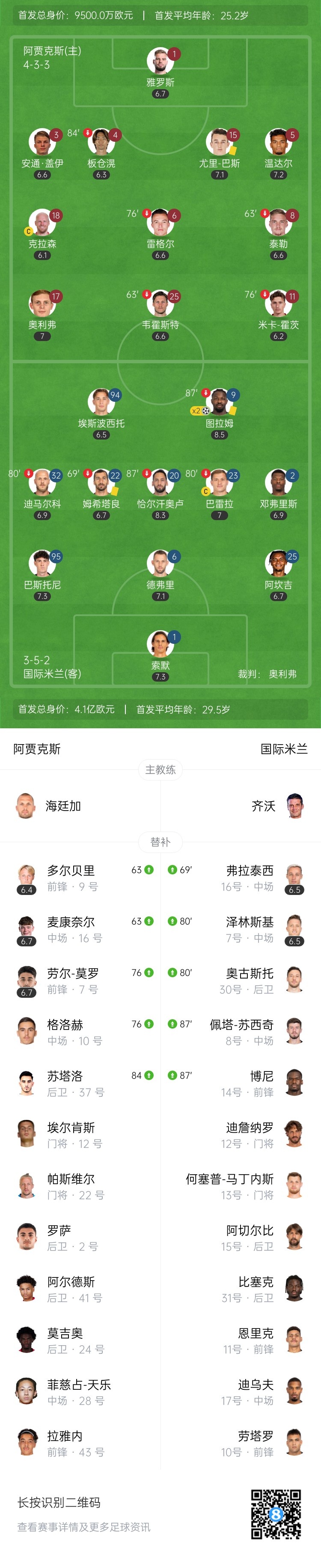 9月18日讯 北京时间9月18日凌晨3:00,欧冠联赛阶段第1轮,阿贾克斯坐镇约翰-克鲁伊夫球场迎战国际米兰。上半场小图拉姆造点被VAR取消,索默扑单刀,尾声阶段恰尔汗奥卢助攻小图拉姆头球破门,国米暂1-0阿贾克斯;下半场恰尔汗奥卢助攻小图拉姆再下一城,最终国米2-0阿贾克斯,取得欧冠开门红。