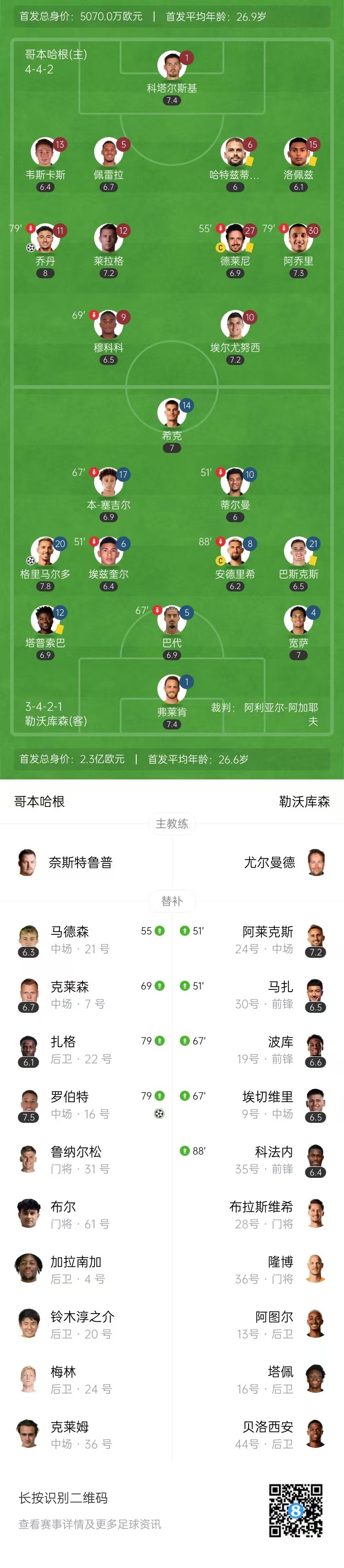 全场比赛结束,哥本哈根2-2勒沃库森。
