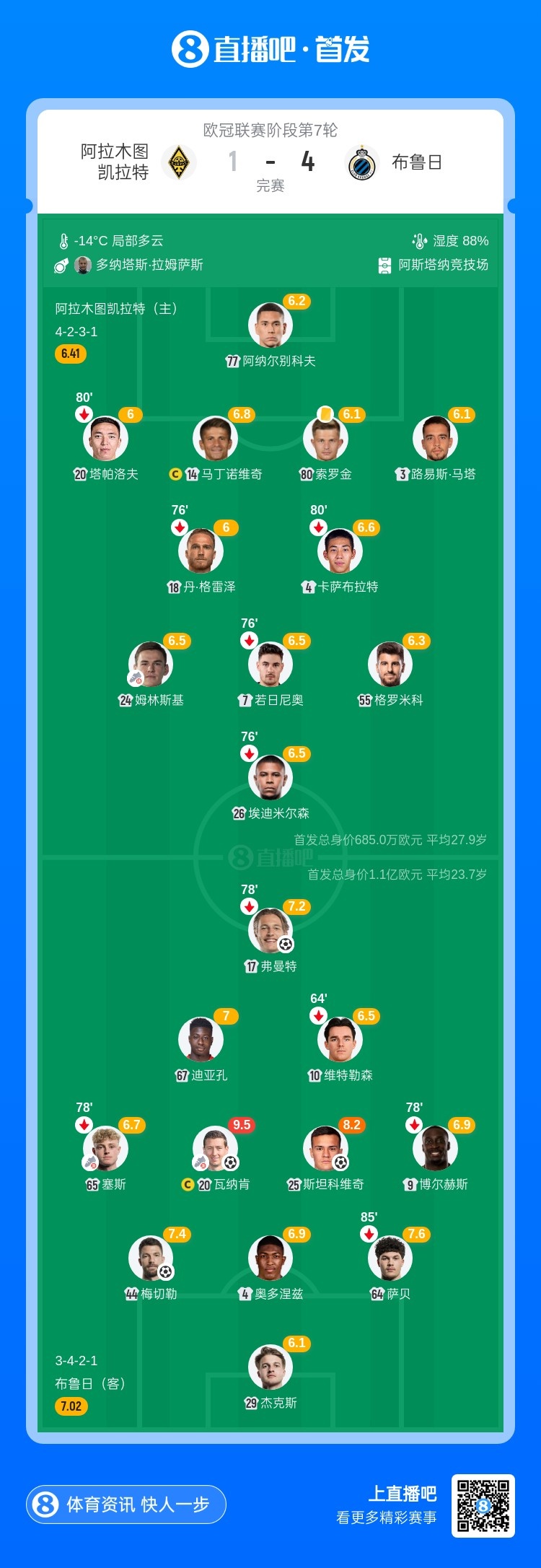布鲁日4-1客胜阿拉木图凯拉特 瓦纳肯1传1射 弗曼特、梅切勒破门