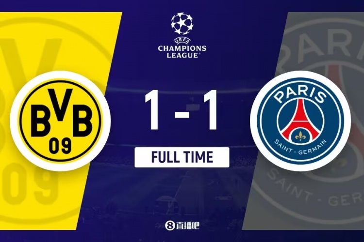 下半场伤停补时6分钟,全场比赛结束,最终巴黎1-1多特。