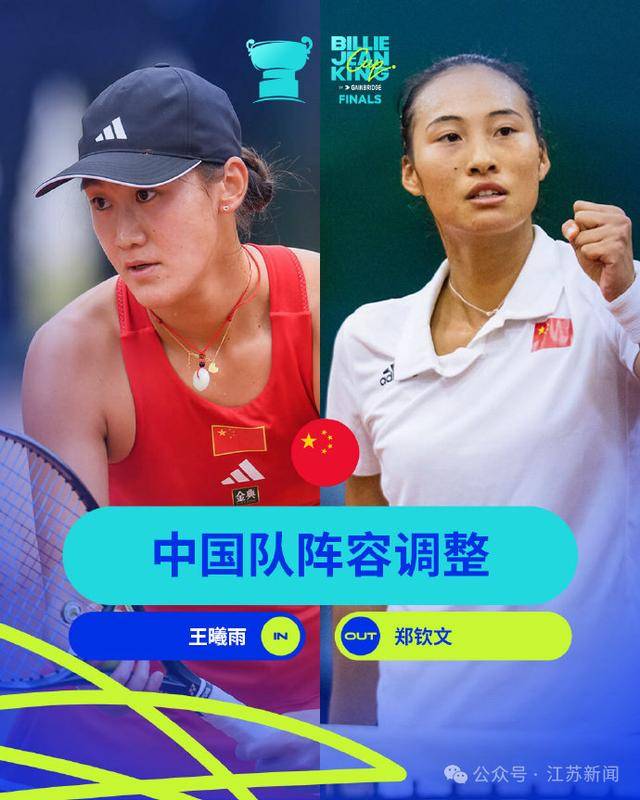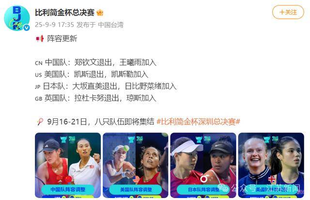 9月9日,比利·简·金杯赛事组委会最新确认,中国金花郑钦文因肘部手术恢复期未愈,无奈退出本次赛事,队友王曦雨将顶替出战。中国队与意大利队的1/4决赛首战定于16日17:00进行。