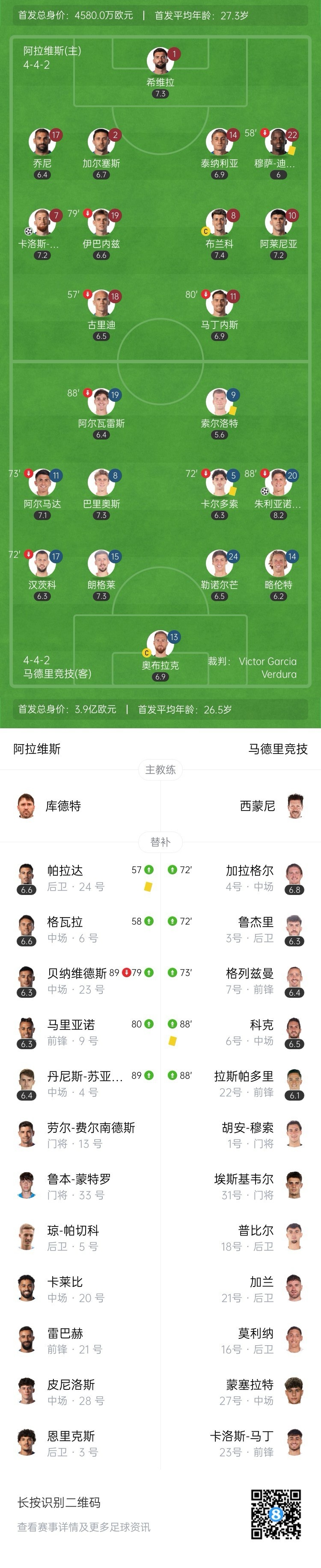镜头给到马竞主帅西蒙尼和阿拉维斯主帅库德特。↓
