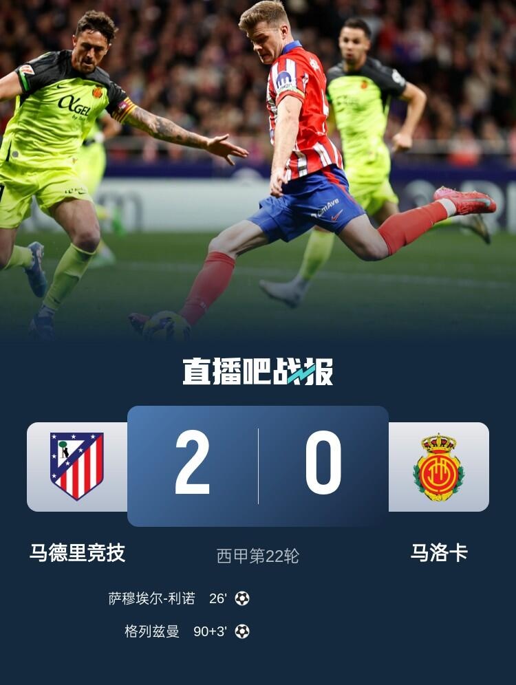2月2日讯北京时间2月2日01:30,西甲联赛第22轮马竞迎战马洛卡的比赛在利雅得航空大都会球场进行,上半场小西蒙尼助攻利诺抽射首开记录,索尔洛特失良机,下半场里克尔梅定位球中楣,格列兹曼吊射破门,最终马竞2-0马洛卡先赛距榜首1分。