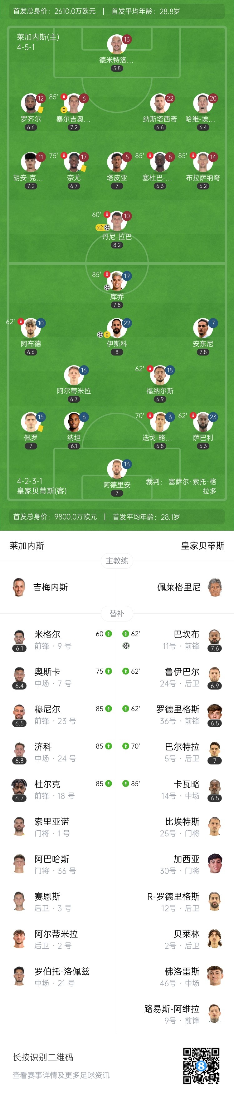 第82分钟,巴坎布直塞,安东尼告诉前插杀入禁区横传!伊斯科踢空,后点库乔抽射破门!(官方算作了伊斯科助攻)贝蒂斯连扳3球!3-2反超莱加内斯↓