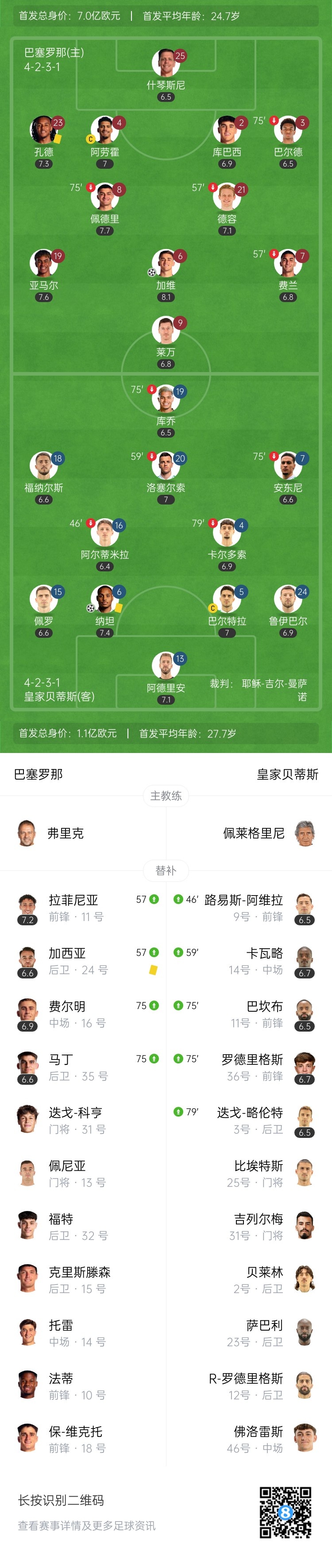 第7分钟,孔德右路横传,费兰-托雷斯直塞,加维前插后禁区内小角度低射远角得手,巴萨1-0贝蒂斯。↓