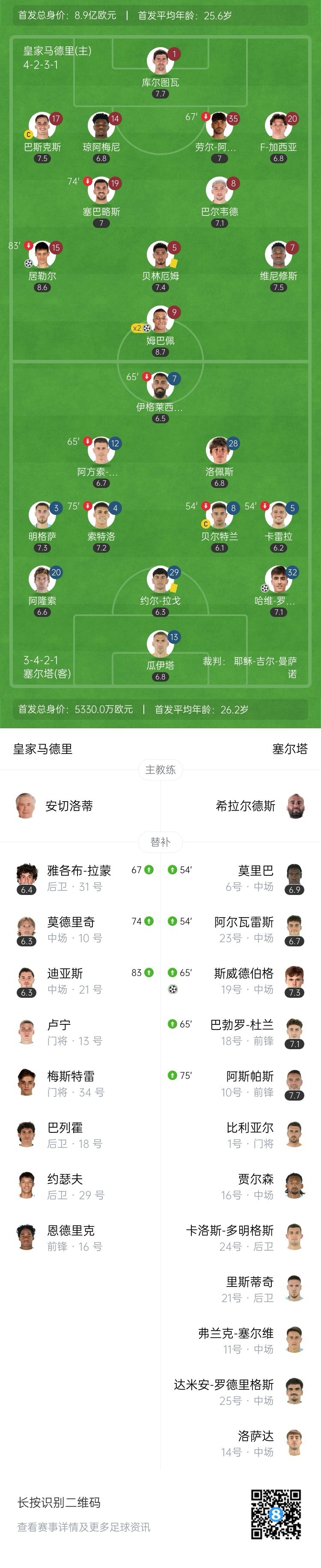 全场比赛结束,皇家马德里主场3-2险胜塞尔塔。
