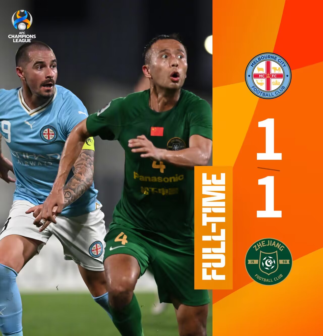 亚冠-浙江1-1墨尔本城小组出局 浙江队2胜1平3负积7分小组第三