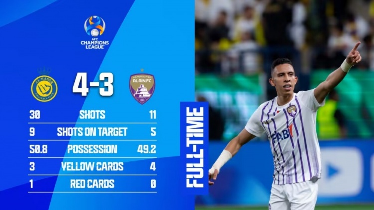 阿尔艾因出场阵容:17-艾萨、3-库阿梅、5-朴镕宇、6-纳德尔(99’27-沙姆西)、8-阿巴斯(78’30-哈奇姆)、10-罗梅罗、11-阿赫巴比、15-梅内塞斯(70’44-朱马)、16-哈什米、20-帕拉西奥斯、21-拉希米