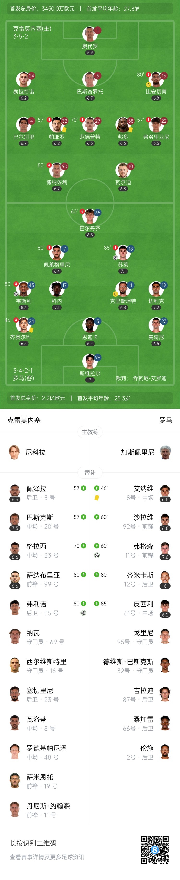 伤停补时4分钟。全场比赛结束,克雷莫内塞1-3罗马。