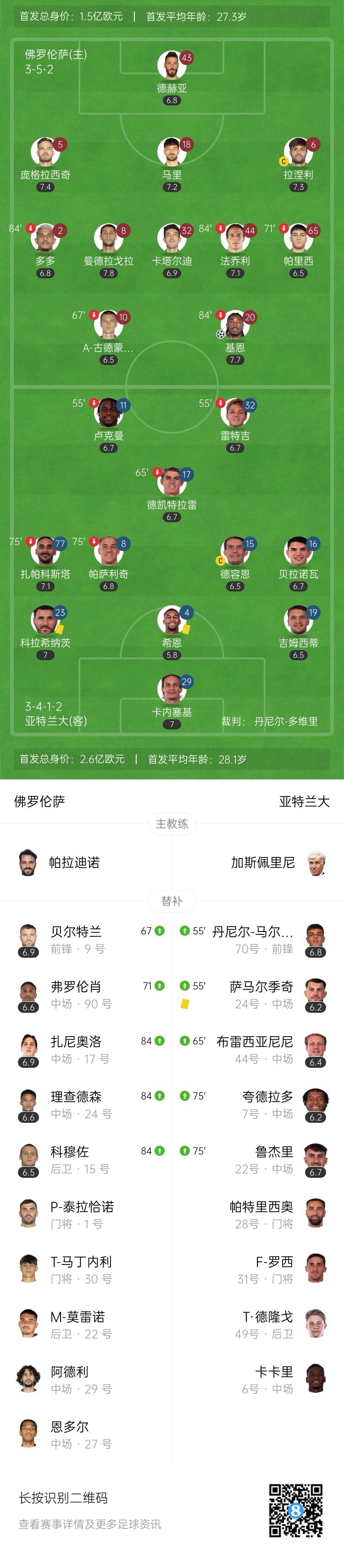 全场比赛结束,佛罗伦萨1-0击败亚特兰大。