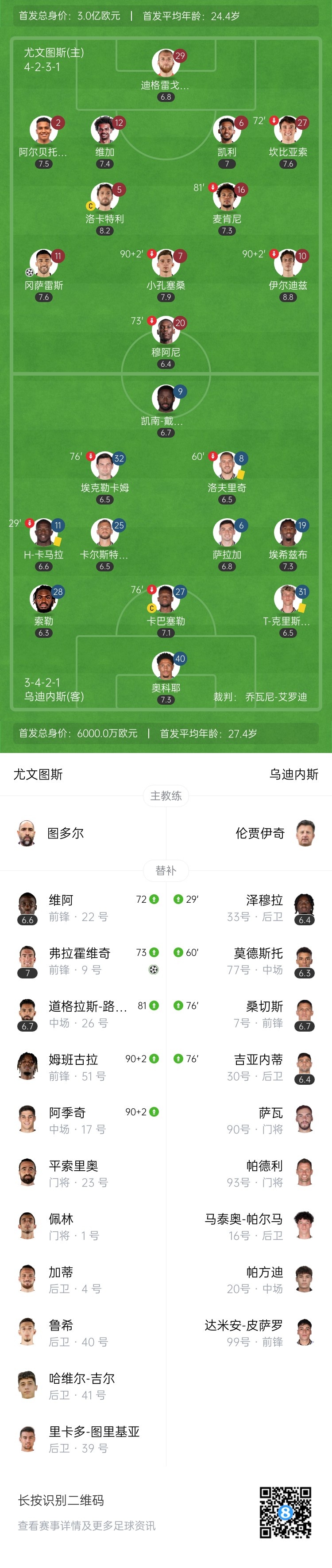 下半场补时4分钟。最终全场比赛结束,尤文2-0乌迪内斯。