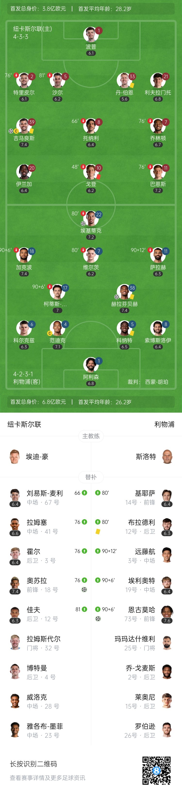 第57分钟,利夫拉门托左路传中,吉马良斯禁区内力压科尔克兹头球破门!10人纽卡扳回一球1-2利物浦↓