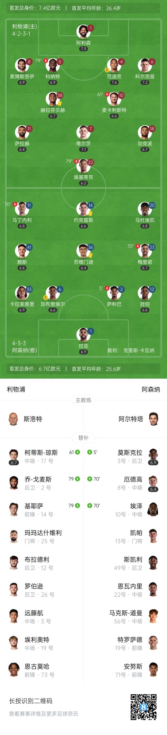 下半场补时7分钟,利物浦1-0阿森纳。