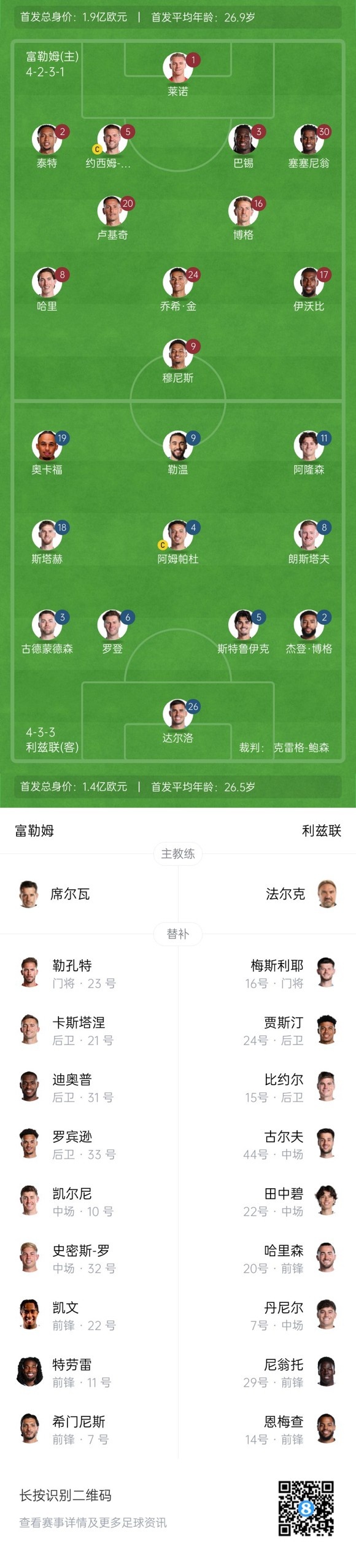 第94分钟,富勒姆绝杀!右路角球开到禁区门前古德蒙德森头球自摆乌龙,富勒姆1-0利兹联。↓