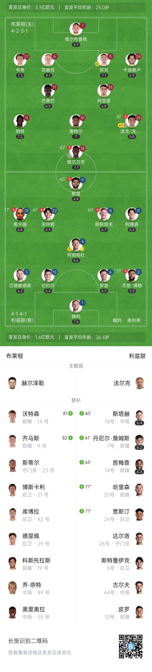 第11分钟,布莱顿首开记录!明特右路弧顶挑传禁区韦弗下底传到门前维尔贝克包抄破门,布莱顿1-0利兹联。↓