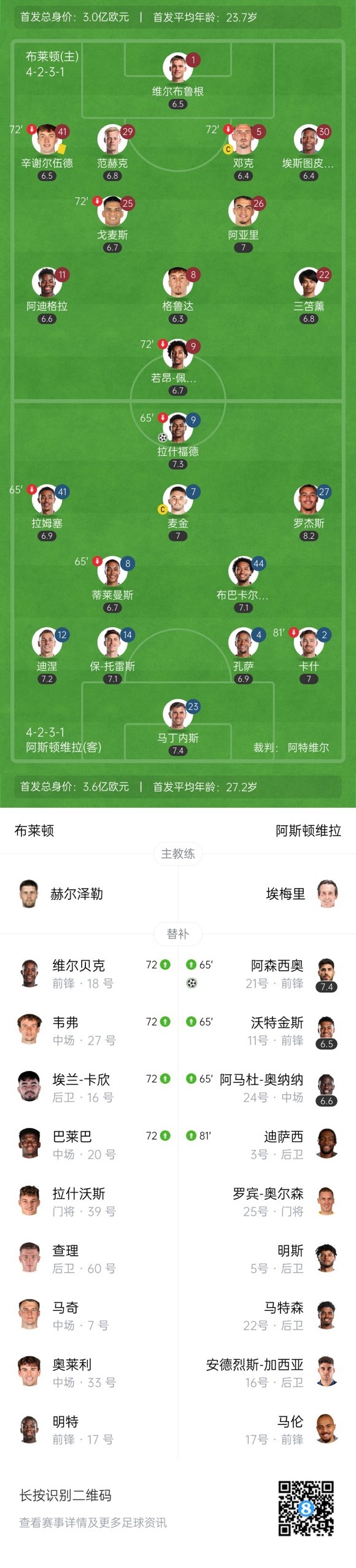 下半场补时10分钟,布莱顿0-3维拉。