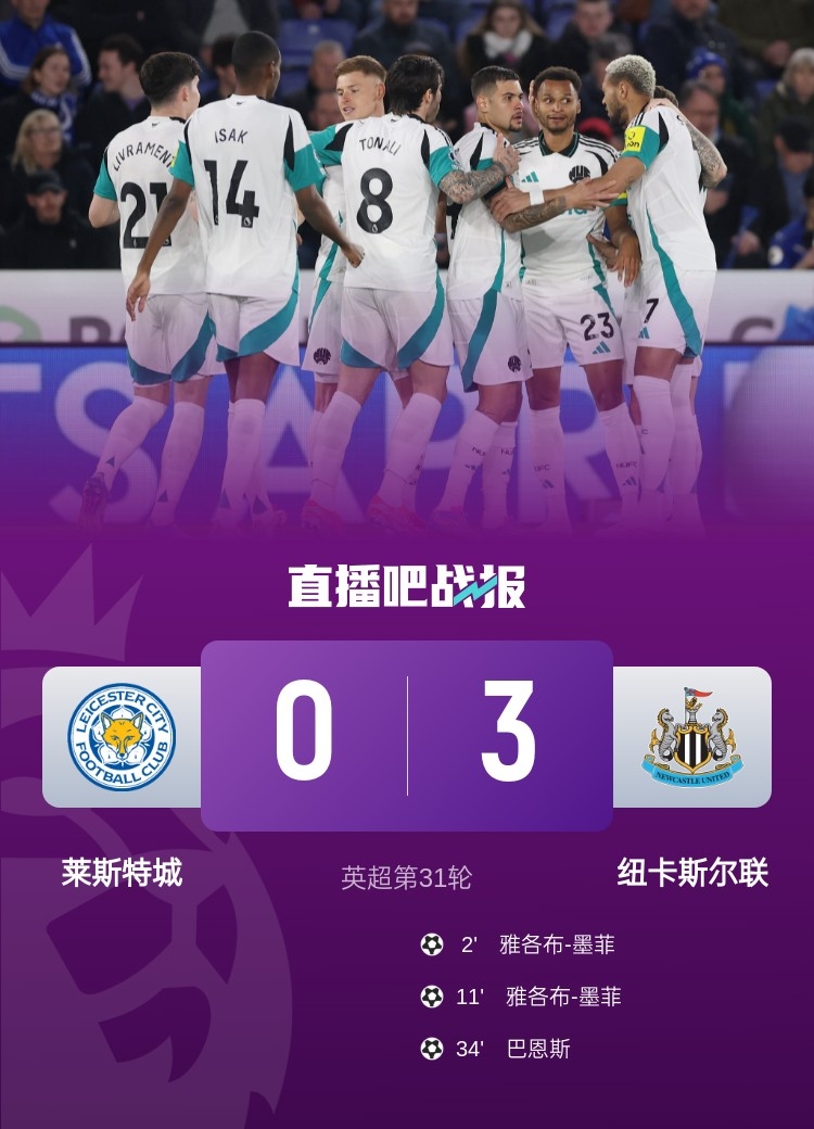 争四白热化!纽卡3-0送蓝狐八连败,纽卡少赛追平蓝军&超越曼城