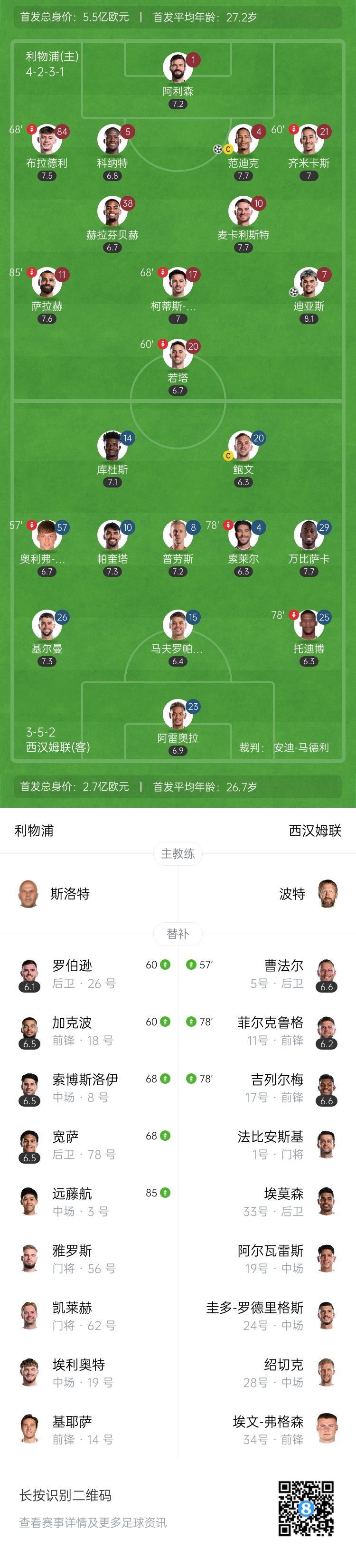 第89分钟,利物浦角球机会,麦卡利斯特将球开向门前,范迪克头球攻门顶进,利物浦2-1西汉姆。↓