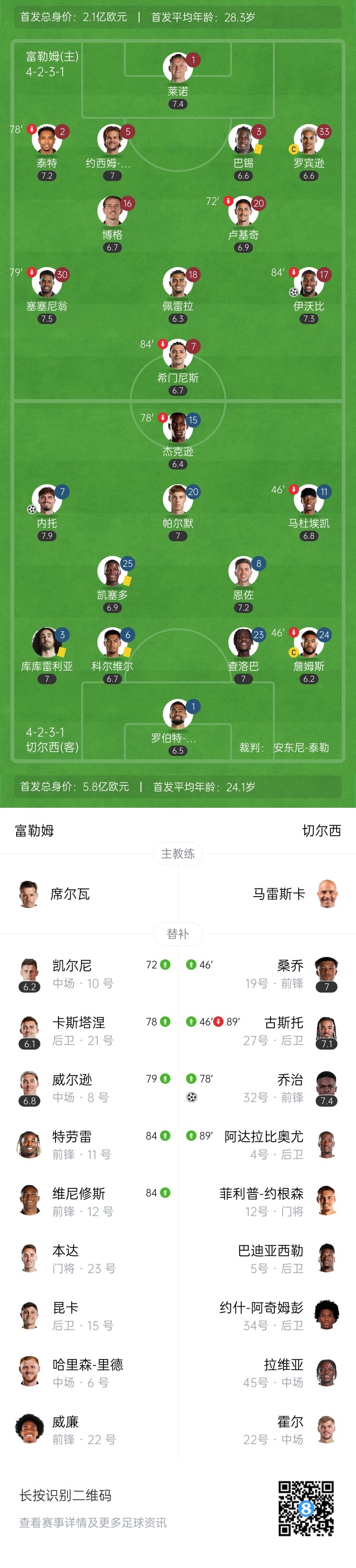 第83分钟,切尔西围攻,内托接到队友挑传摆渡给帕尔默,帕尔默处理球受到干扰,球来到乔治脚下,后者弧顶内抬脚就打,这球莱诺扑救不及,切尔西1-1富勒姆。↓