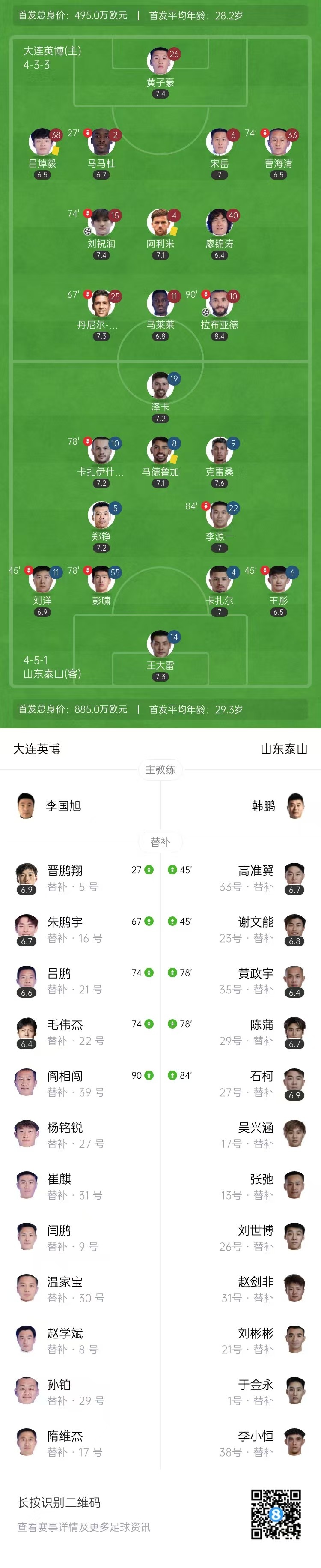 第81分钟,拉布亚德前场左侧任意球直接破门,大连英博2-0山东泰山。↓