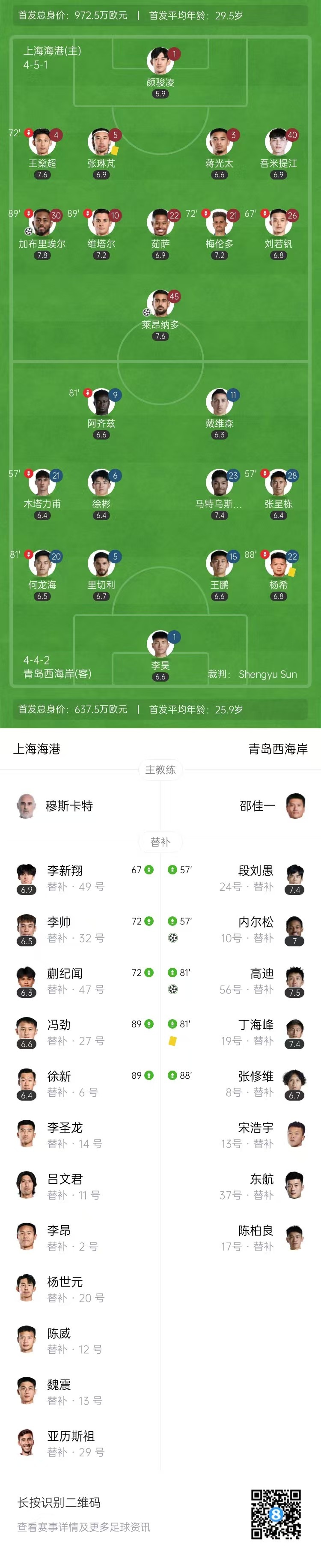 第45+11分钟,梅伦多前场远射被扑,莱昂纳多补射破门,上海海港1-0青岛西海岸。↓