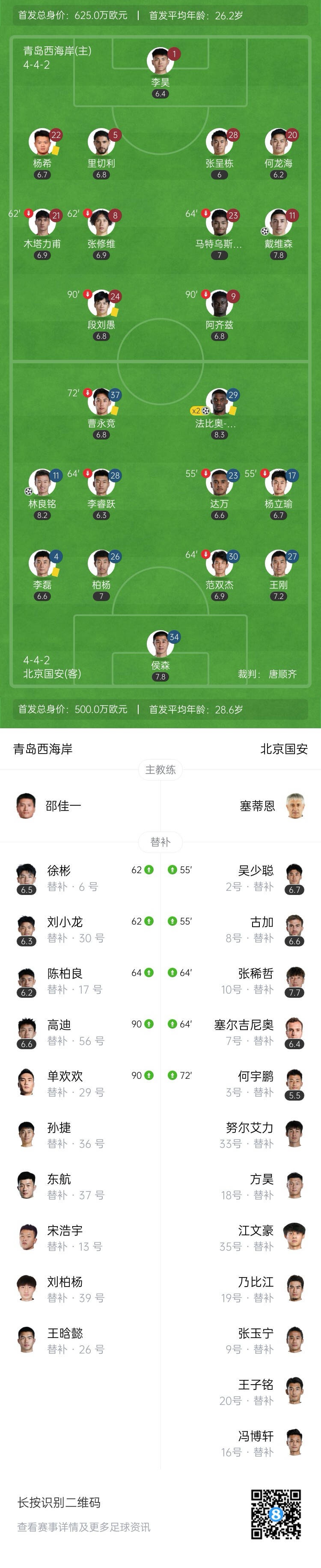 全场比赛结束,最终北京国安3-1青岛西海岸。