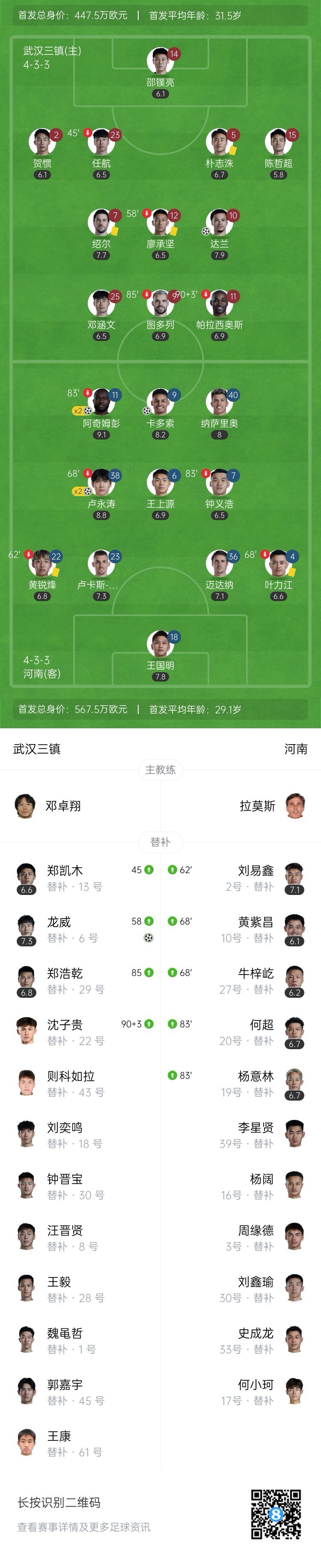 全场比赛结束,武汉三镇主场2-5不敌河南队。